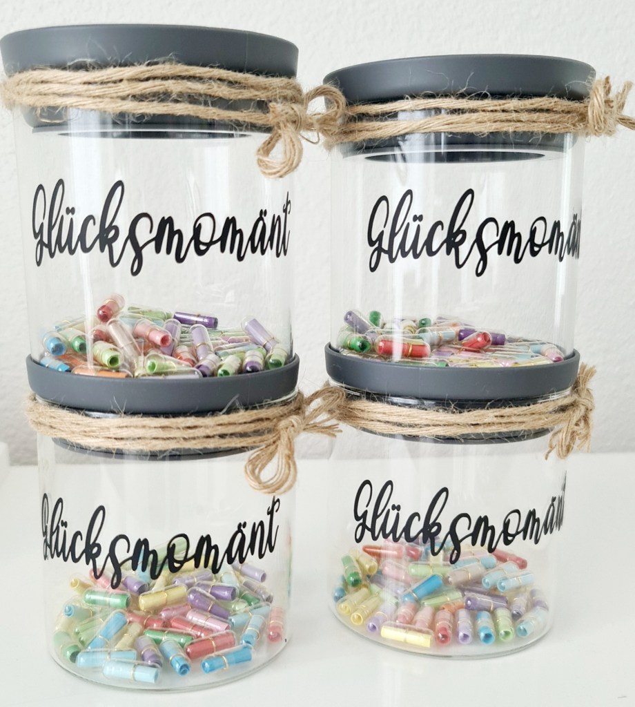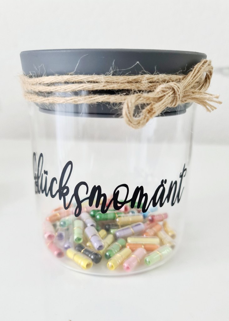 Inhalt: 52 Chapsle mit schwarze/ farbige leeri Zätteli für eui persönliche Glücksmoment (für jedi Wuche vom Jahr)