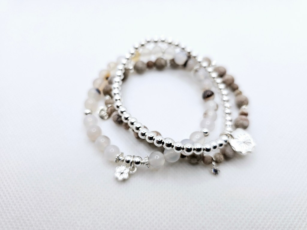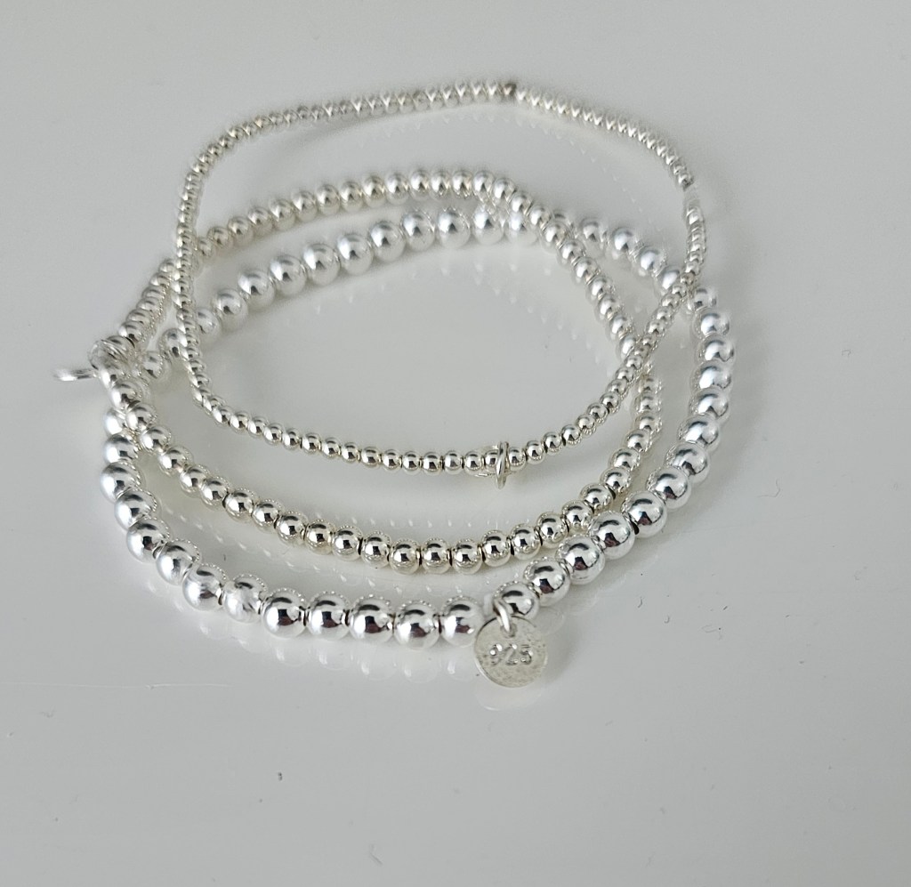 3 Elastische Armbänder. Die Silberperlen werden auf einen elastischen Faden aufgezogen.