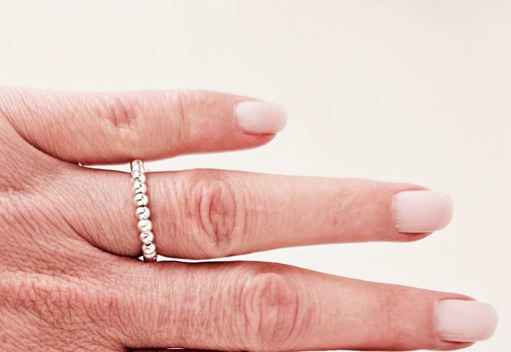 Elastisches Armband. Die Silberperlen werden auf einen elastischen Faden aufgezogen.