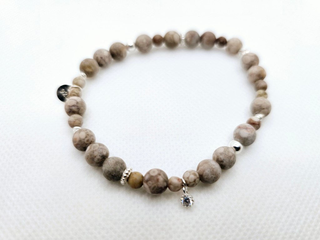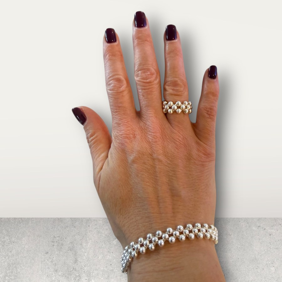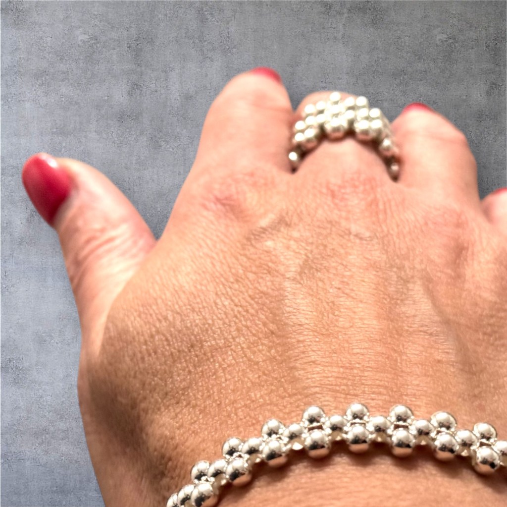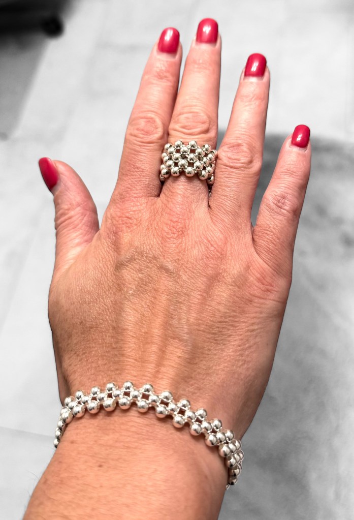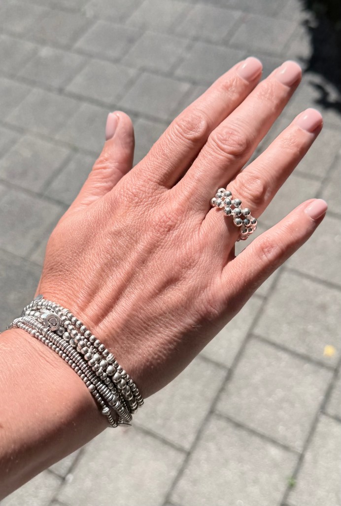 1 elastisches Armband. Die Silberperlen werden auf einen elastischen Faden aufgezogen.